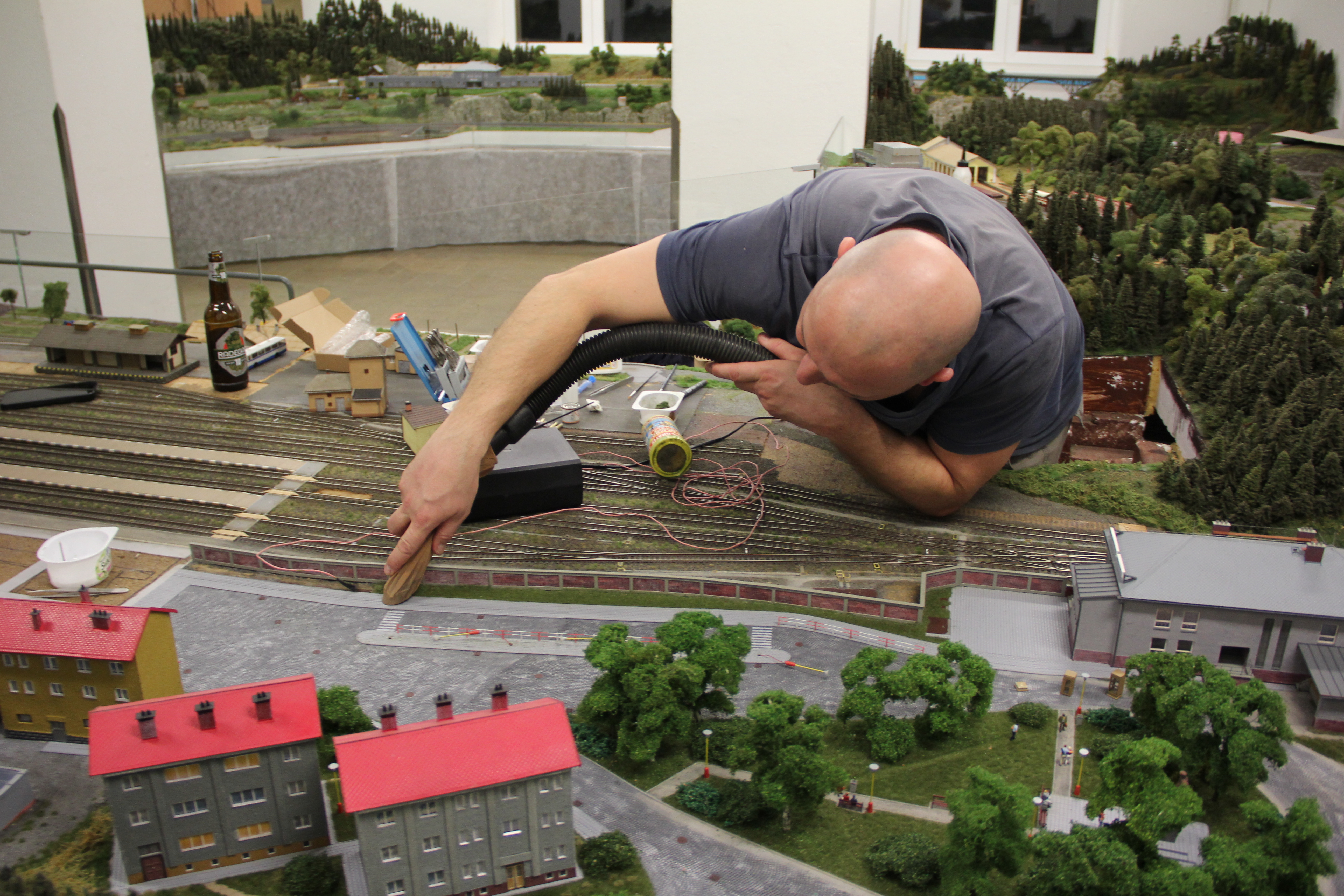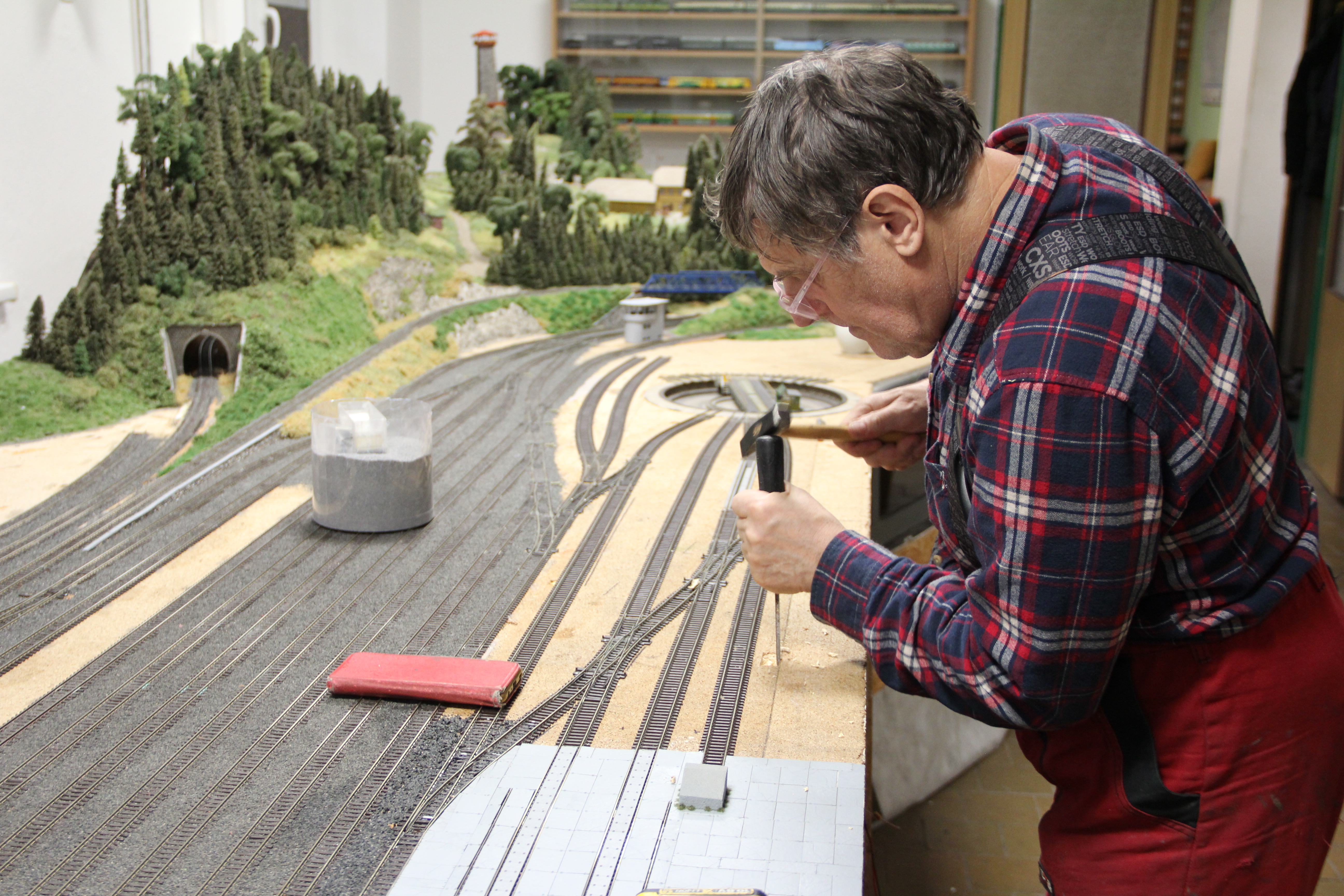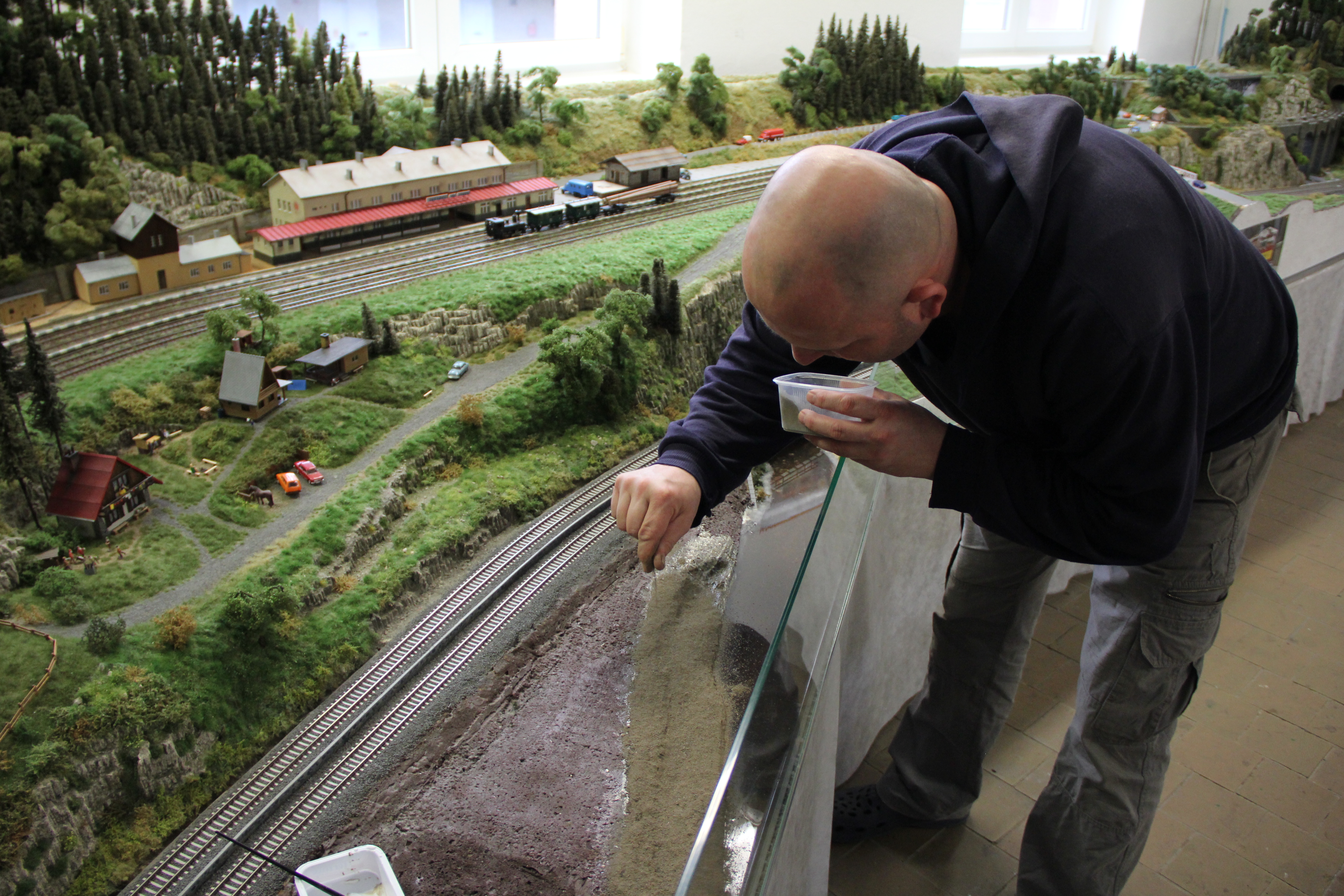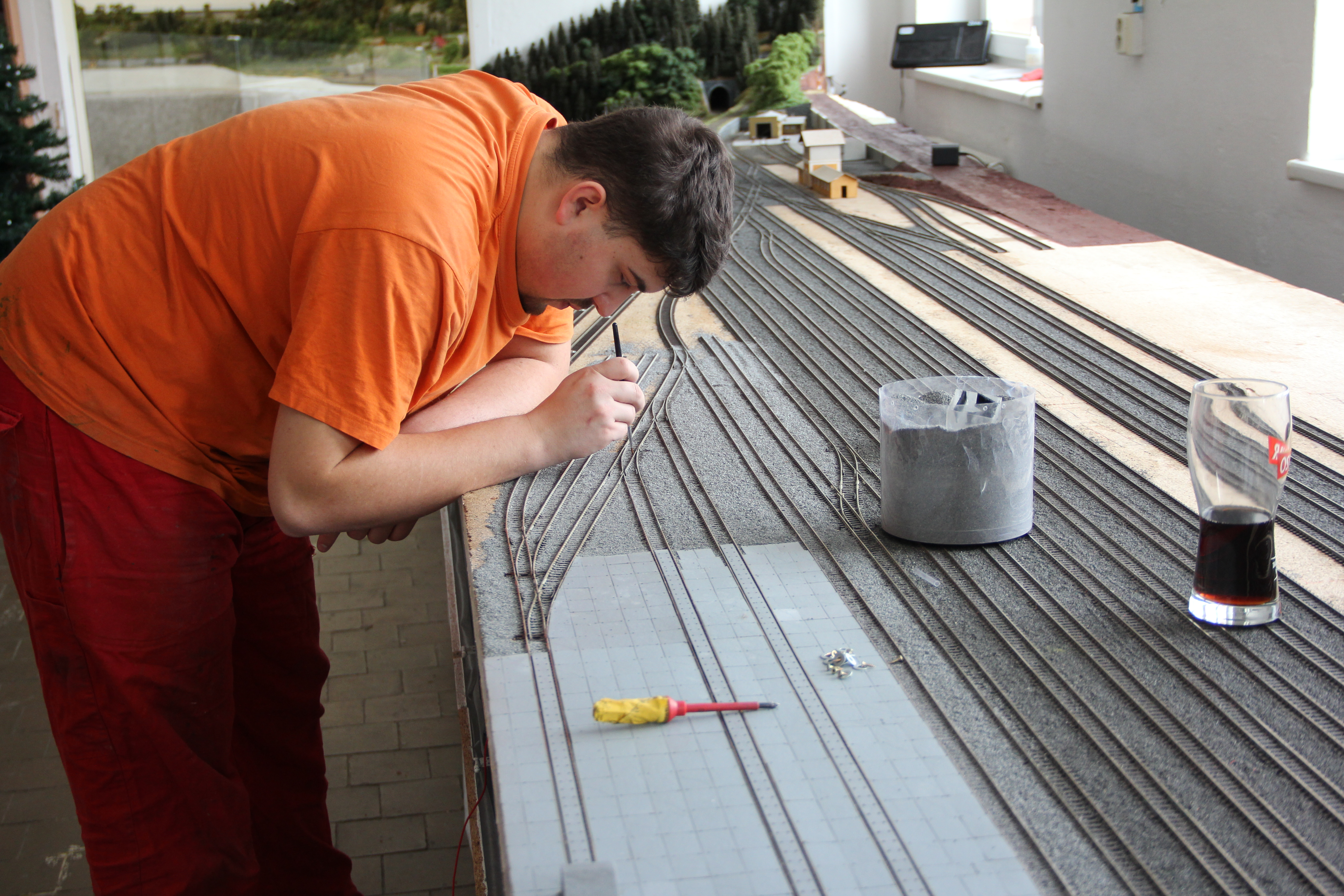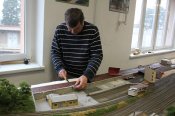 Tomáš štěrkuje odstavné koleje.